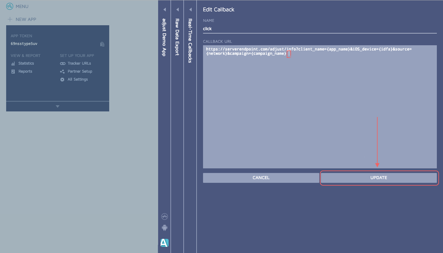 The AdLibertas Adjust integration allows you to send callback events from your app to your AdLibertas account. This requires we give you a customized URL to enable real-time callbacks from the Adjust dashboard.