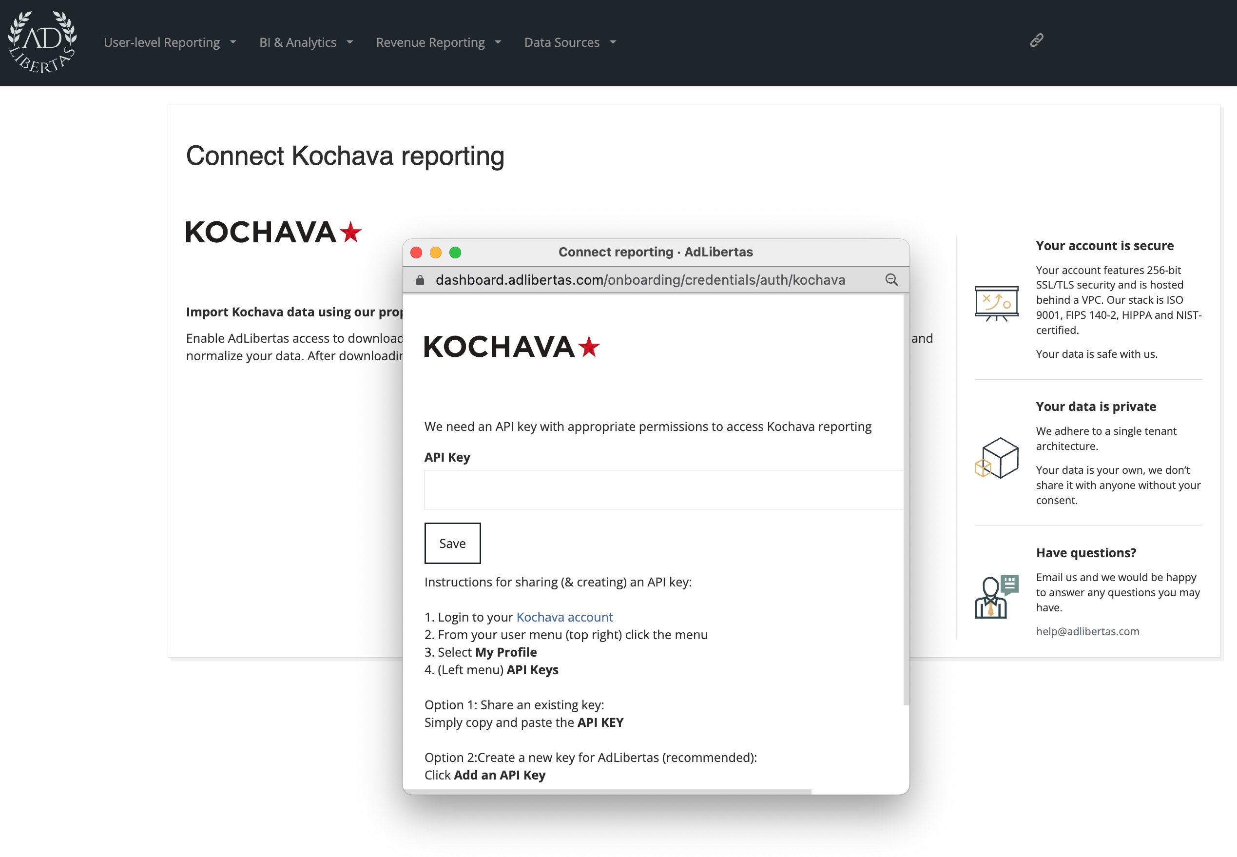 To connect with Kochava, simply add a user from the Kochava dashboard with the following naming convention: